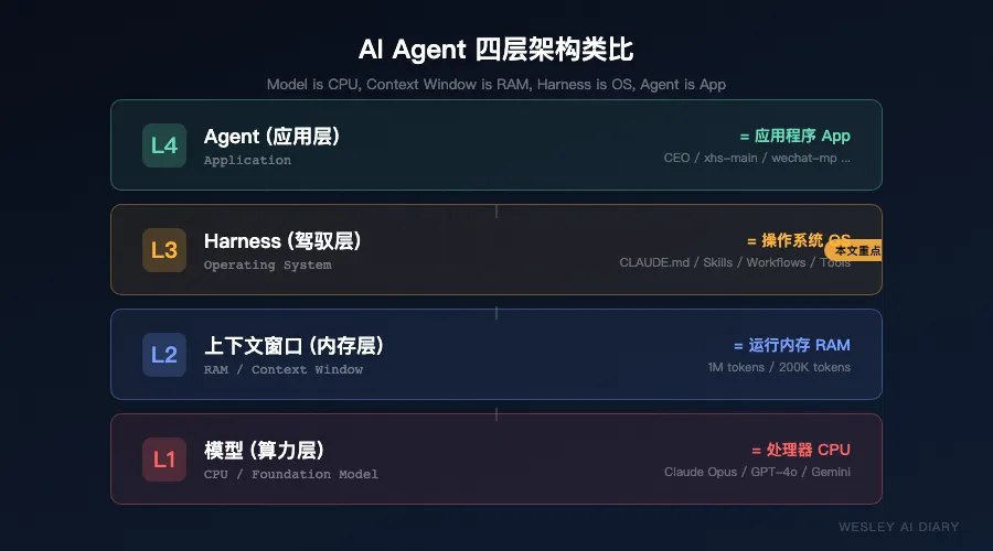 打个比方:模型是 CPU,上下文窗口是 RAM,Harness 是操作系统,Agent 是应用程序。