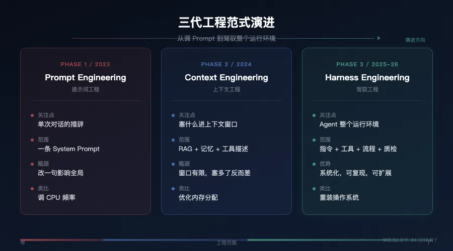为什么失败率这么高?因为大多数团队还停留在 Prompt Engineering 思维里——以为写一个好的 Prompt 就够了。甚至进阶一点的团队,也只走到了 Context Engineering——精心管理"给 Agent 看什么信息"。