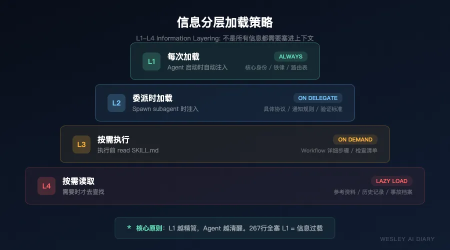 L1 每次加载:核心身份、铁律、路由表——Agent 每次启动都必须读到的信息