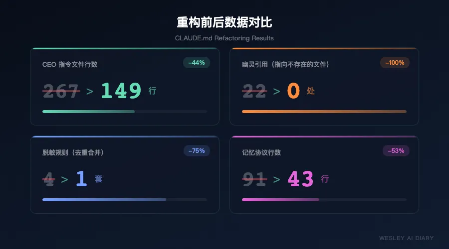每次遇到问题,第一反应是"加规则"。但 267 行的经历告诉我,真正的功力在于如何用最少的文字表达最完整的约束。-44% 不是删掉了内容,是提纯了信息。