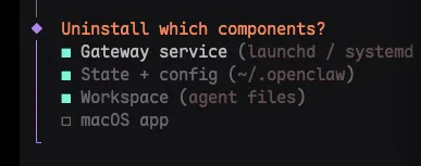 openclaw uninstall执行后会弹出交互提示,选择「Gateway service, State + config, Workspace」,确认即可。