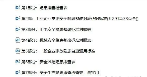 【自助下载】隐患对应依据,这才是最全版本!专业!强烈建议收藏!★ 资料包整体截图展示 ★▲篇幅限制, 非全文展示。☆本资料一键获取方式☆【知识星球】限时特惠!仅需60元/年(低至5元/月),即刻享受海量安全资料一键下载。点击下方名片获取更多兄弟号资料【免费资料】推荐下载清单【自助下载】2026开年第一件事:落实安全责任制,签订安全责任书!送安全生产责任制资料大全!【自助下载】2026年安全工作计划汇编(目标分解、检查、培训、演练、安全投入计划等)!【自助下载】官方发布《危险化学品企业安全管理和政府安全监管工作手册》,374页可下载!【自助下载】变配电室安全检查指引图片示范!【自助下载】JHA和JSA的割裂人生!附JHA工作危害(作业安全)分析资料汇编!【自助下载】官方发布《应急处置安全指导手册》,可下载【自助下载】官方发布《消防检查指导手册》!【自助下载】高危、动火、有限空间、高处及其他危险作业安全监护、监督过程分析!【自助下载】安全标识资料大全,附高清大尺寸安全标识汇编,直接下载直接用!【自助下载】官方发布《建筑施工安全管理实用手册》,432页可下载!【自助下载】电气仪表专业安全风险隐患排查方式及隐患排查重点!【自助下载】行为安全观察与沟通(BBS)资料汇编!【自助下载】员工各类急救手册汇编!【自助下载】安全生产十大禁令、十大定律、十大理念、十大事故合集!【自助下载】危险化学品企业关键设施安全风险辨识管控指导手册!【自助下载】知名标杆国企发布EHS文集&问答汇编,涵盖技术、管理、培训、案例,安全人的百科全书!▼更多精品资料下载点击“阅读原文”