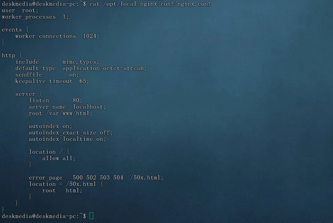 user root;worker_processes 1;events { worker_connections 1024;}http { include mime.types; default_type application/octet-stream; sendfile on; keepalive_timeout 65; server { listen 80; server_name localhost; root /var/www/html; autoindex on; autoindex_exact_size off; autoindex_localtime on; location / { allow all; } error_page 500 502 503 504 /50x.html; location = /50x.html { root html; } }}