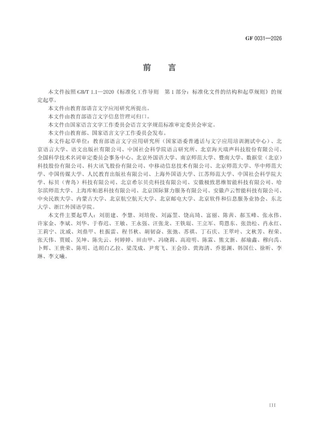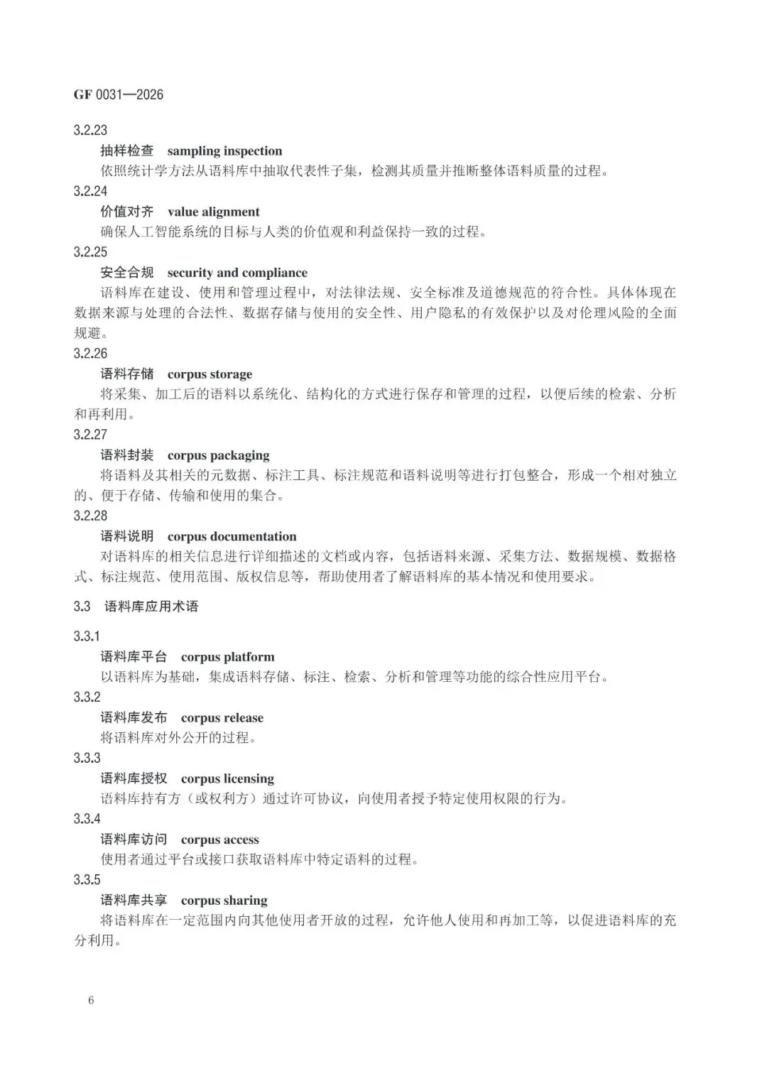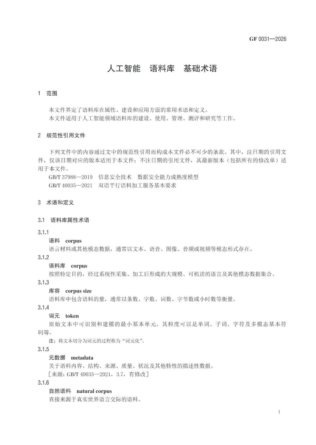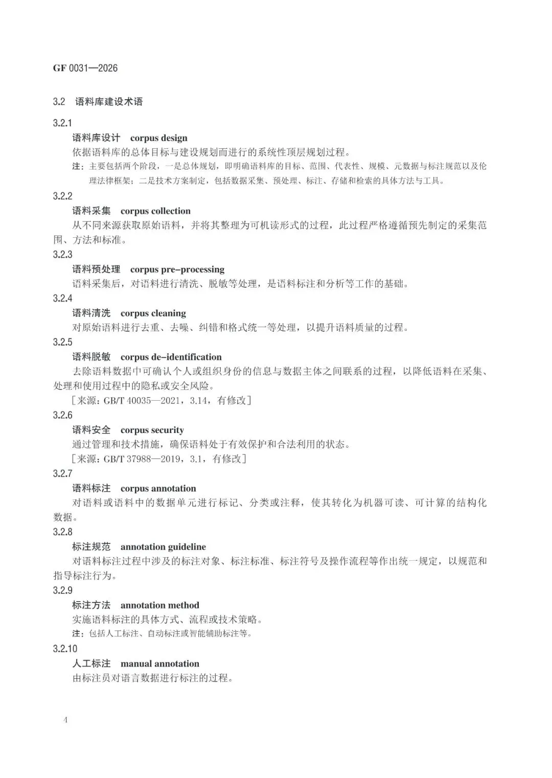 可下载:语委规范《语料库基础术语GF0031 2026》发布近日,教育部、国家语言文字工作委员会正式发布两项语言文字规范:《机器合成普通话水平测评等级标准及测评大纲》和《人工智能语料库基础术语》,标志着我国在人工智能语音技术与语言规范融合发展方面迈出关键一步。其中,《人工智能语料库基础术语》聚焦语料库领域的基础概念与核心术语,对相关术语的定义、内涵及使用范围进行了系统规范,旨在解决当前语料库建设与应用中术语使用不统一、概念界定不清等问题。该标准面向人工智能语料资源建设与应用需求,构建统一、规范、可复用的术语体系,是语料工程领域的重要基础性规范。标准全文现已在教育部官网发布,可通过以下链接获取:http://www.moe.gov.cn/jyb_sjzl/ziliao/A19/202604/t20260407_1433016.html今日责编:双玉酝