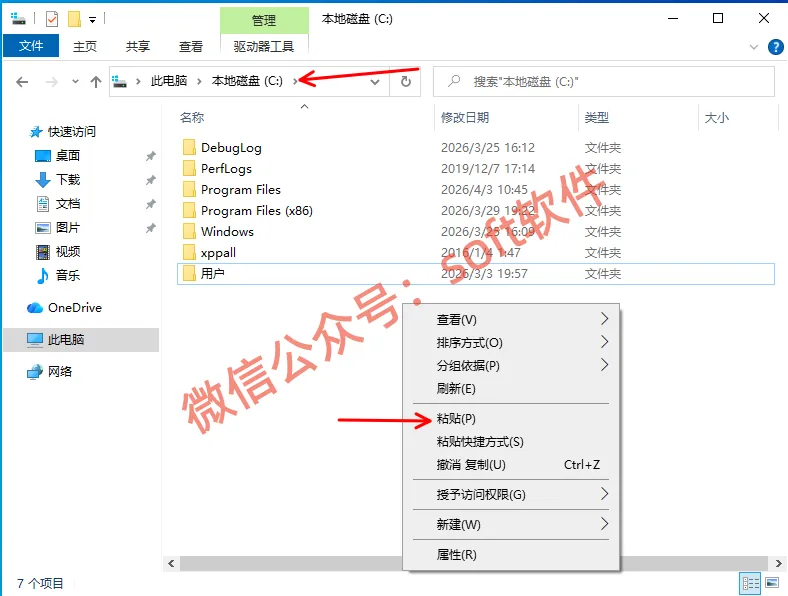11,打开C盘,在空白处鼠标右键,选择粘贴
