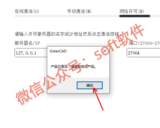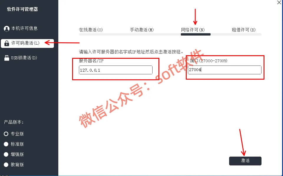 21,选择许可码激活---网络许可---输入服务器名称:127.0.0.1,端口:27004,点激活