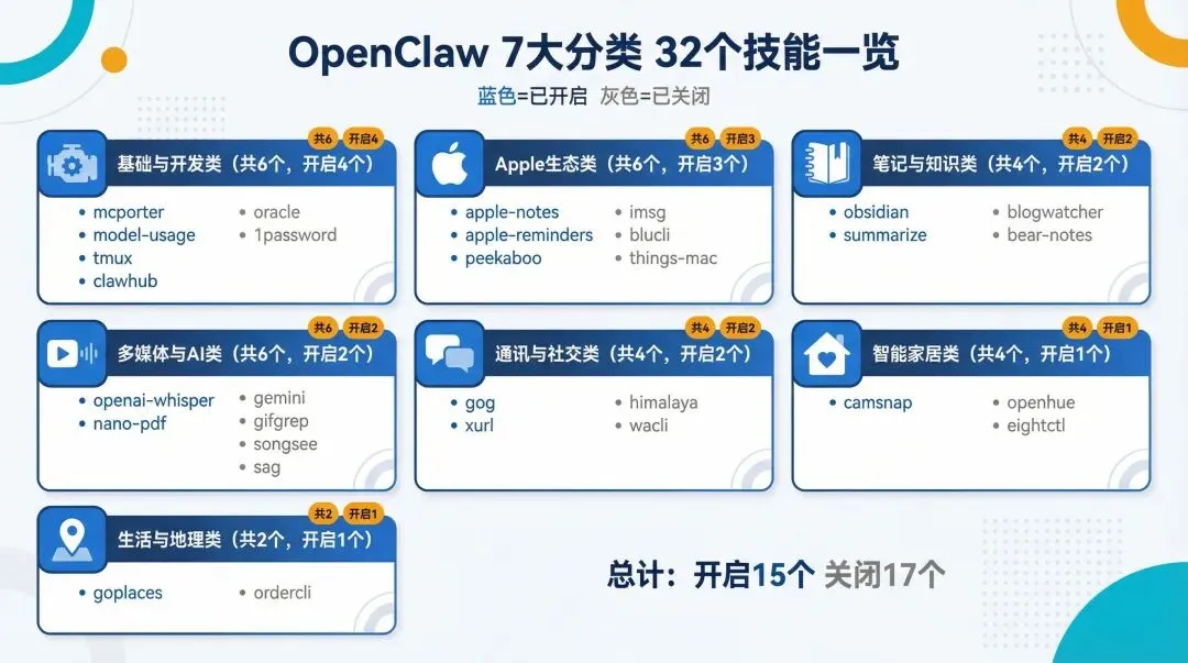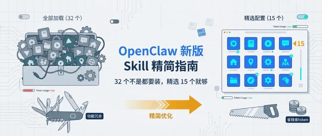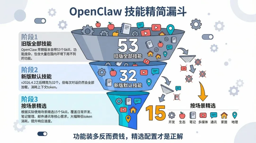 我把最新版 OpenClaw 默认自带的 32 个 Skill 逐一分析,按自己的使用场景精选了 15 个,砍掉了 17 个用不上的。(本次分析基于 OpenClaw v2026.4.2 之后的版本,之前有 53 个 skill,现在只有 32 个)
