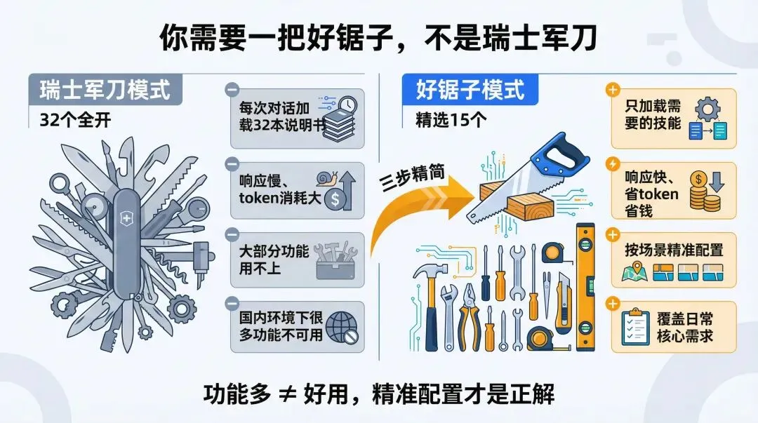 你以为你只装了 OpenClaw,但实际上你同时把笔记管理、邮件收发、社交媒体、智能家居、音乐播放、订单追踪等这些莫名其妙的功能全部塞进了它的脑子里。如果你让一个人的脑子在回答问题时,同时查阅 32 本说明书里面找答案,他也会变得非常慢。