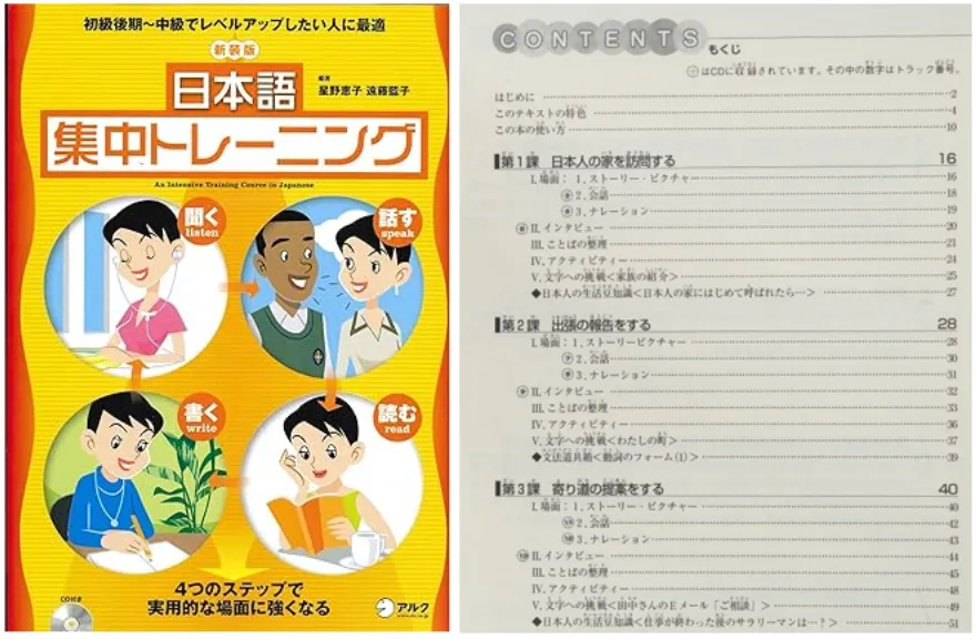 ストーリーに沿ったイラストで場面をイメージ。「ナレーション」や「インタビュー」で役になりきってトレーニング。実用性重視の「読む練習」「書く練習」で運用力がつく。初級後期〜中級でレベルアップしたい人に最適。
