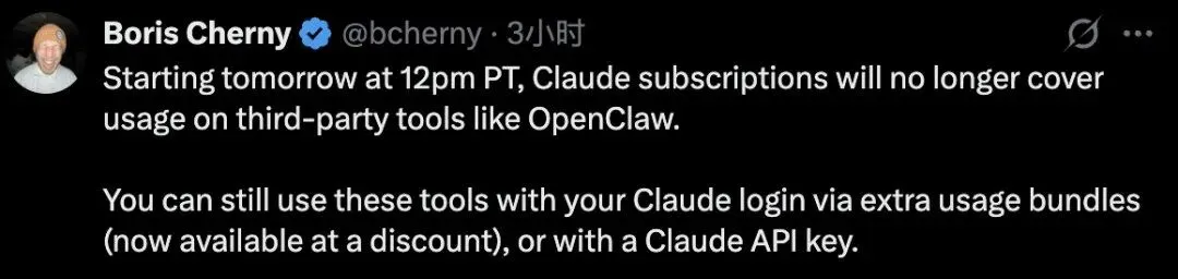 Boris Cherny(claude code之父)宣布,从明天(美东时间12点)起,Claude订阅套餐将不再覆盖OpenClaw等第三方工具的使用。也就是Anthropic 的新政策变更,将 OpenClaw 与 Claude AI 结合使用的成本即将大幅上涨,这基本上就是封杀龙虾。
