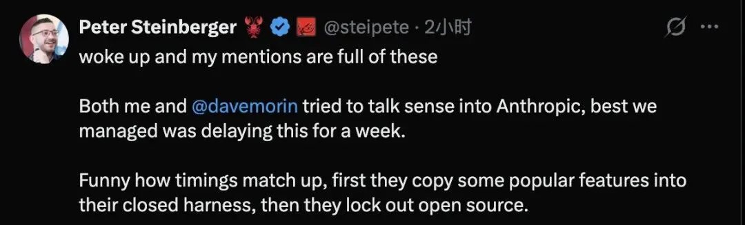 他还指出了一个时间上的巧合:Anthropic先是将OpenClaw的一些热门功能整合进自家封闭产品,随后便开始封锁开源工具的订阅通道。