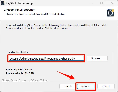 6.选择软件安装路径,建议和教程中的保持一致,本例安装到D盘(将路径地址中的首字符C改为D表示安装到D盘,安装路径不要出现中文),点击“Next”