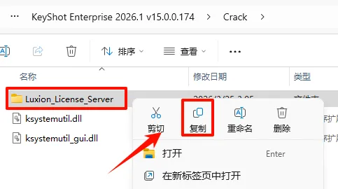 10.返回之前解压的“KeyShot Enterprise 2026.1 v15.0.0.174”文件夹,双击打开“Crack”文件夹,选中“Luxion_License_Server”文件夹,鼠标右键选择“复制”