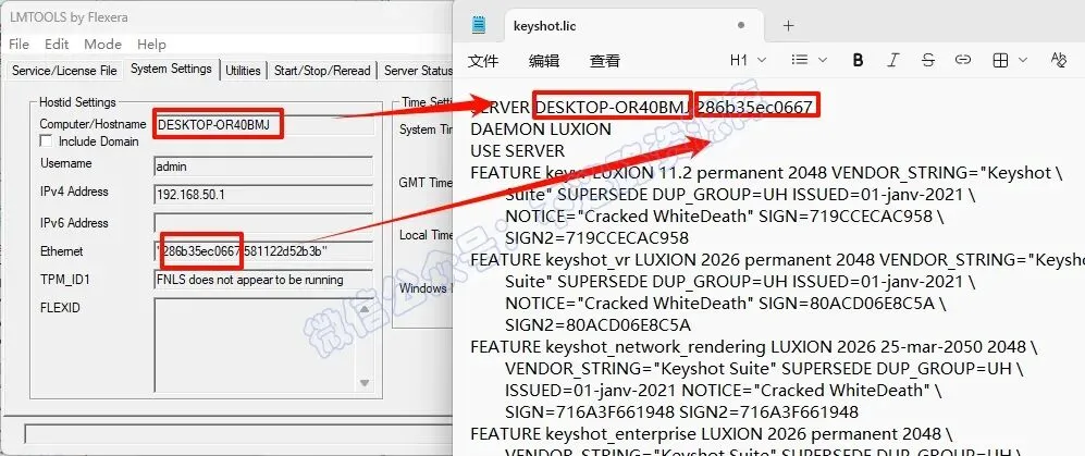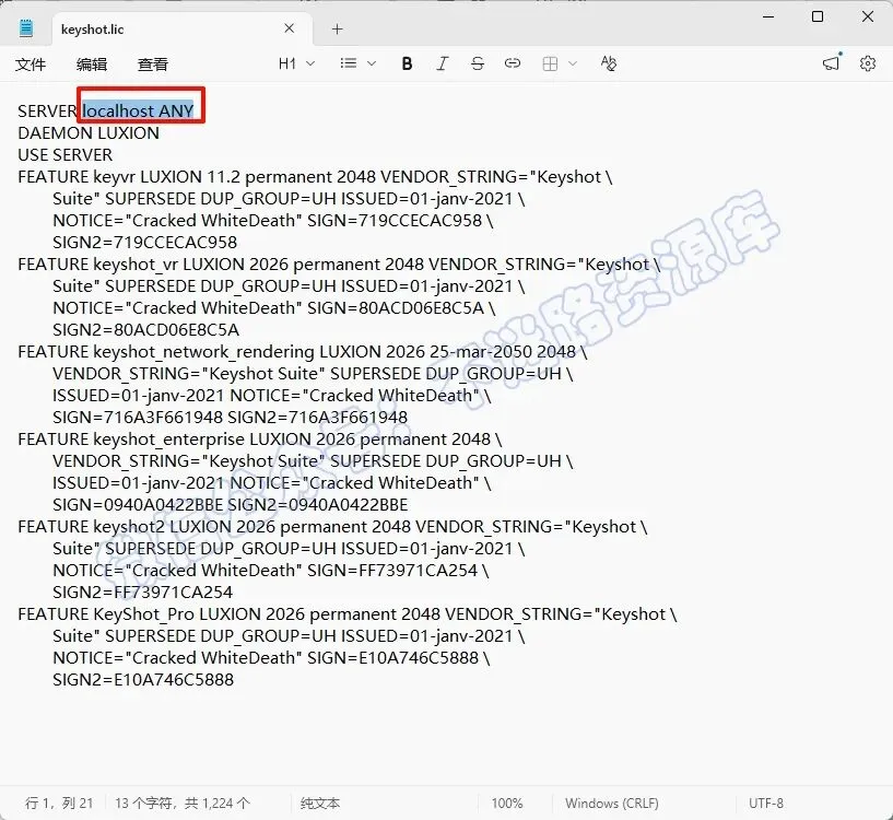 16.在打开的文本keyshot.lic中将“localhost”替换成主机名,将“ANY”替换成