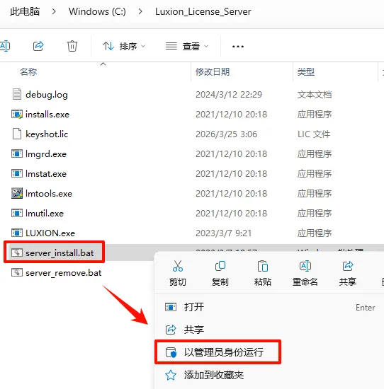 18.返回“Luxion_License_Server”文件夹,鼠标右键点击“server_install.bat”选择“以管理员身份运行”(运行前请关闭电脑中杀毒软件)