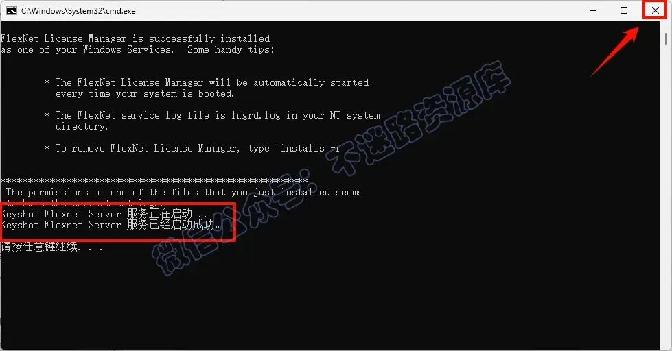 19.提示“服务已经启动成功“,点击右上角的“X“关闭