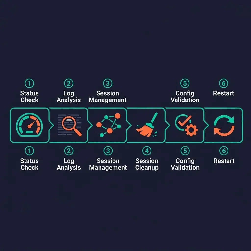 **操作流程:**看状态 → 看日志 → 清会话 → 校配置 → 再决定是否重启