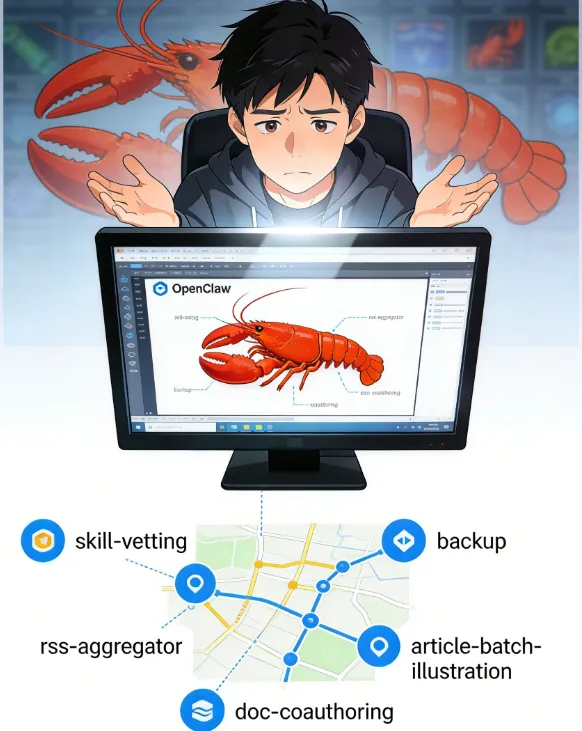 帮我安装 skill-vetting帮我安装 backup帮我安装 rss-aggregator帮我安装 doc-coauthoring帮我安装 article-batch-illustration