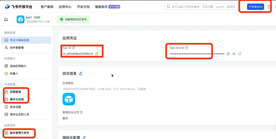 同时,依次设置好权限管理,事件回调, 最后进行发布生效, 可以参考Step4。