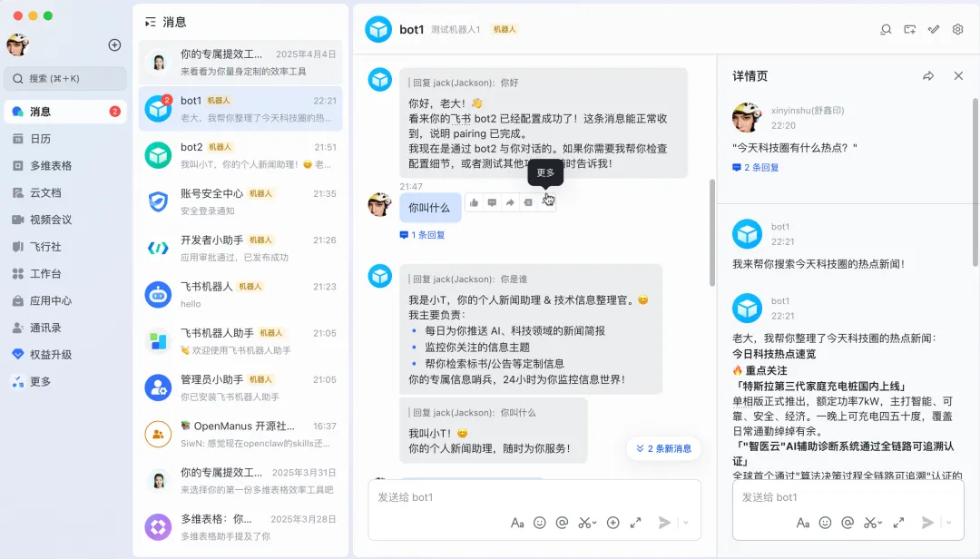 说白了就是:你在飞书里给Bot发消息,OpenClaw收到后转发给对应的Agent,Agent处理完再通过飞书回复你。