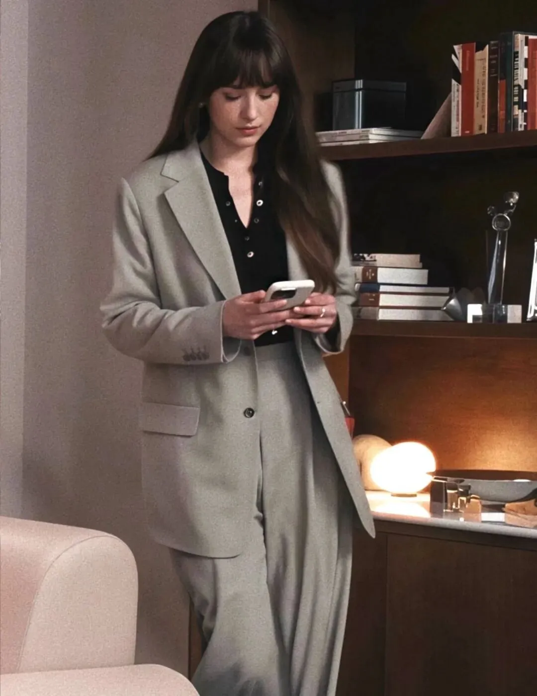 搭配一件米白色真丝质感的宽松衬衫,V领设计自然露出锁骨,弱化了正式感,多了几分慵懒随性。