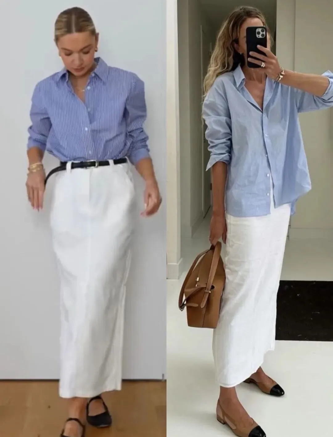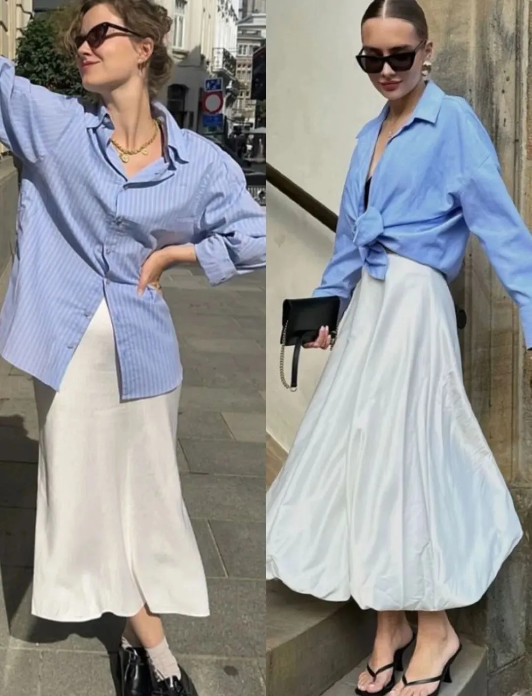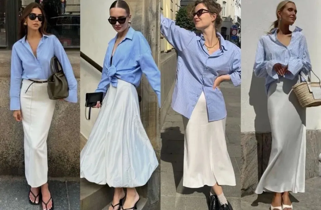 宽松的落肩袖型+微阔的袖口,自带垂坠感,把随性的氛围拉满,同时浅蓝的色调清爽干净,和白色半裙形成温柔的撞色,视觉上非常舒服。