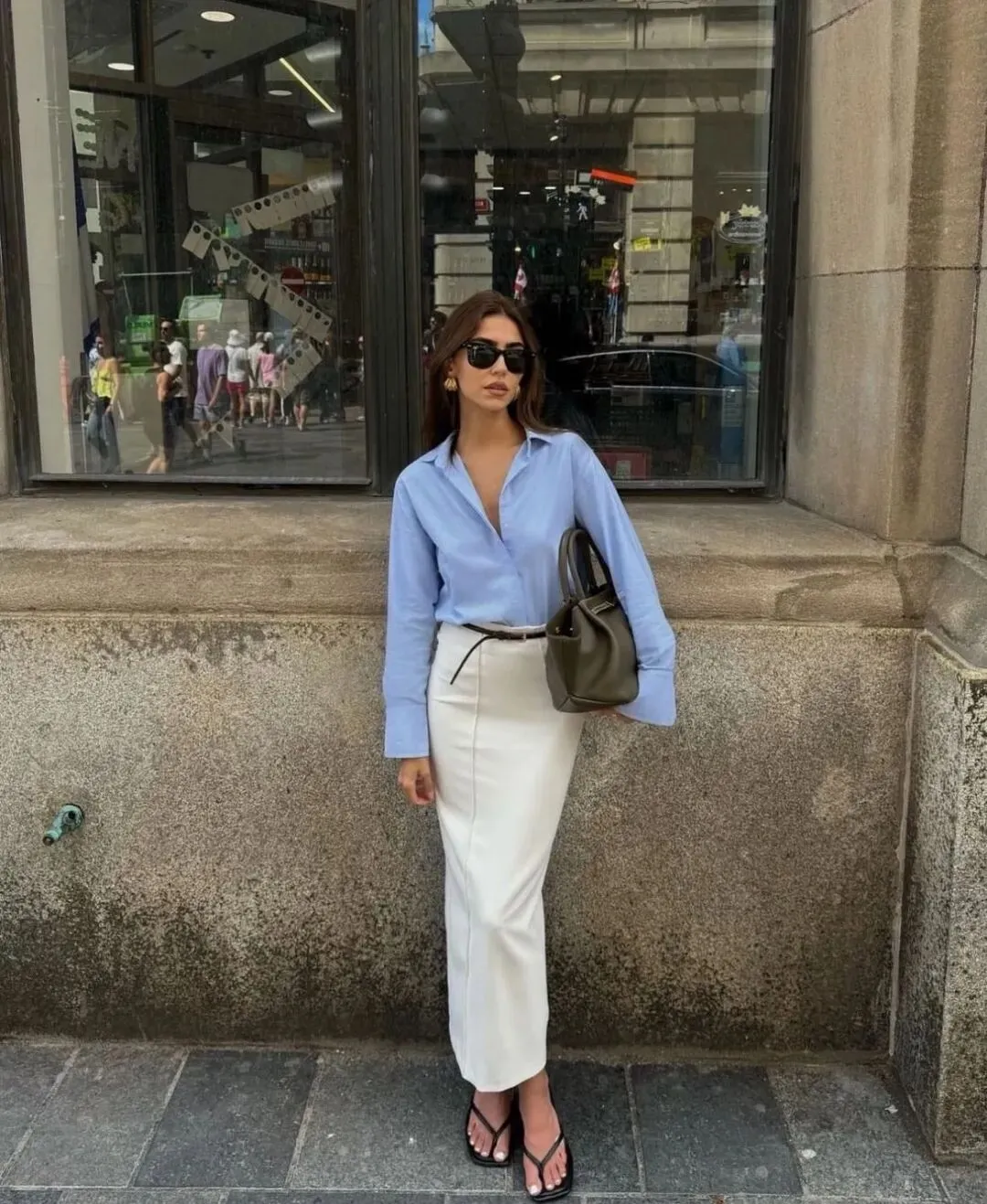 最妙的是用一条细黑皮带在腰际做了收腰,瞬间优化了身材比例,打造出高腰线,让“上松下紧”的穿搭逻辑完美落地,清爽又显高。
