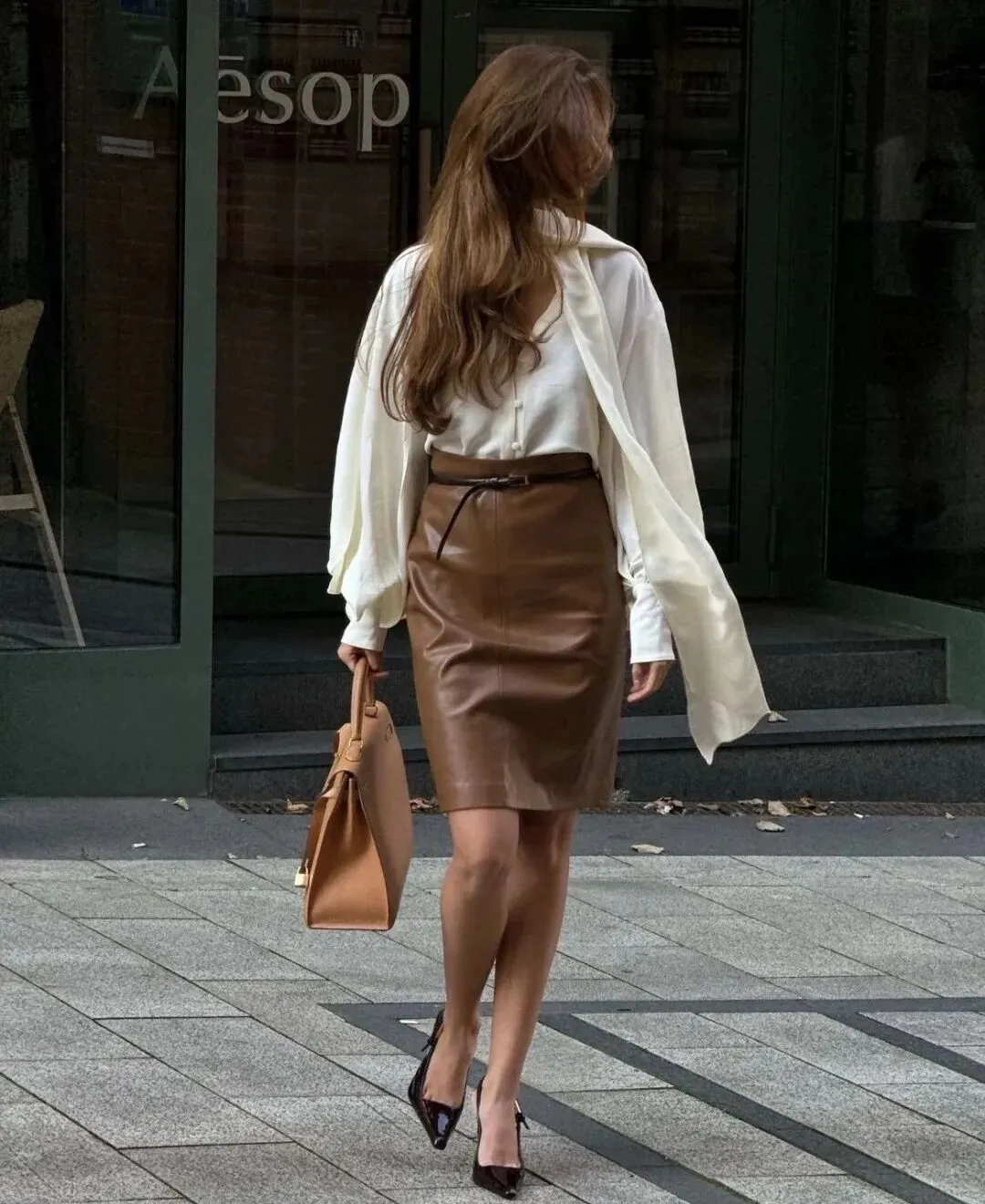 站在咖啡店前的秋日街头,阳光洒在身上,既有通勤的干练得体,又有日常出街的慵懒随性,是那种走在街上会被忍不住回头多看几眼的、自带故事感的穿搭。