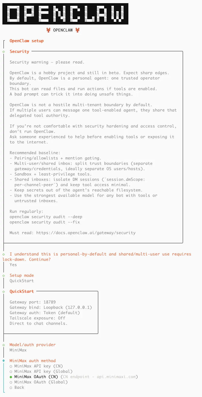 MiniMax auth method → 选择 MiniMax CN — OAuth (minimaxi.com)