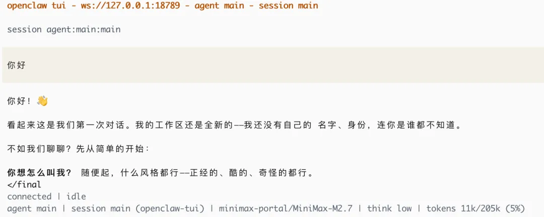 输入 openclaw tui,能正常对话即配置成功。