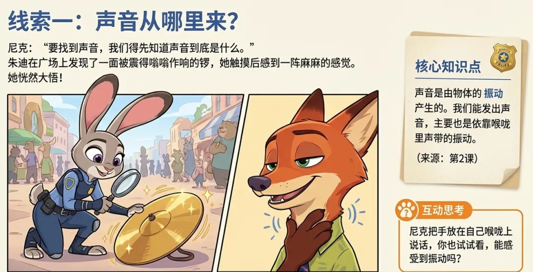 先说说它的整体设计思路。课件借用了《疯狂动物城》的IP,开场就是“城市广场神秘噪音案件,朱迪和尼克需要破案。这个情境一下子把学生拉入任务中,不是被动听讲,而是主动当“声音小侦探。每一页都像案件卷宗:线索一、线索二、关键证人、案件分析室……科学概念被包装成破案工具,学生学起来有目标、有成就感。