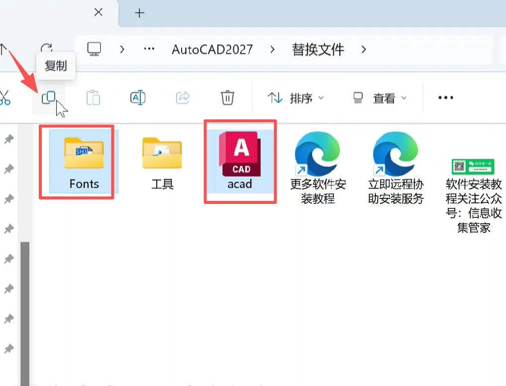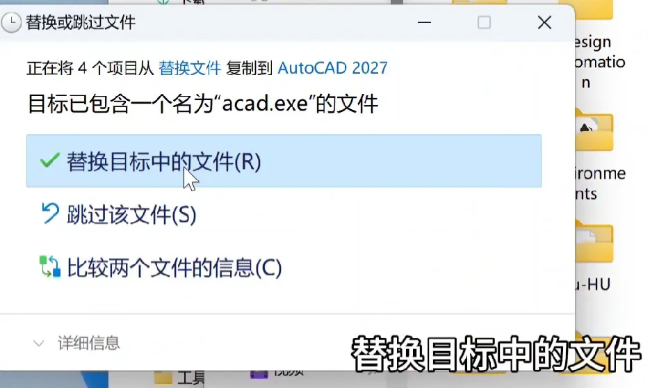 12、接着将【Crack】文件夹下的【acad.exe】复制至软件安装目录中,点击【替换目标中的文件】。