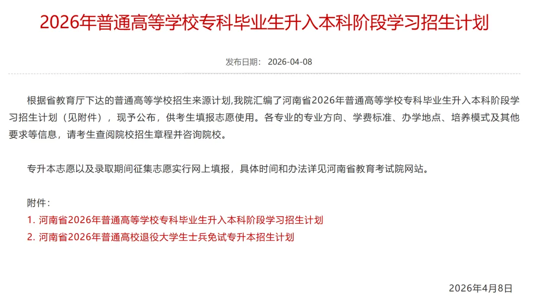 根据省教育厅下达的普通高等学校招生来源计划,我院汇编了河南省2026年普通高等学校专科毕业生升入本科阶段学习招生计划(见附件),现予公布,供考生填报志愿使用。各专业的专业方向、学费标准、办学地点、培养模式及其他要求等信息,请考生查阅院校招生章程并咨询院校。