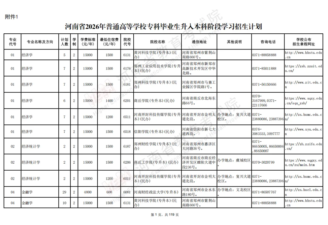 1. 河南省2026年普通高等学校专科毕业生升入本科阶段学习招生计划