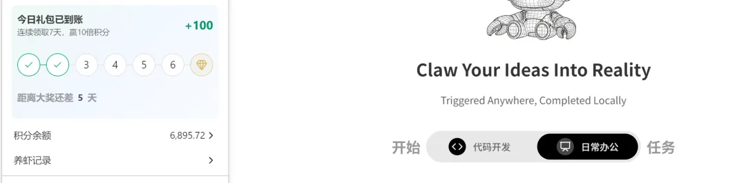 下载安装之后使用微信或者手机号登录就送 3000 credits,加上每天领取的 100 credits以及连续7天领取的 1000 credits,算下来基本够日常使用了,领取的 Credits 可以在 Codebuddy 中使用。