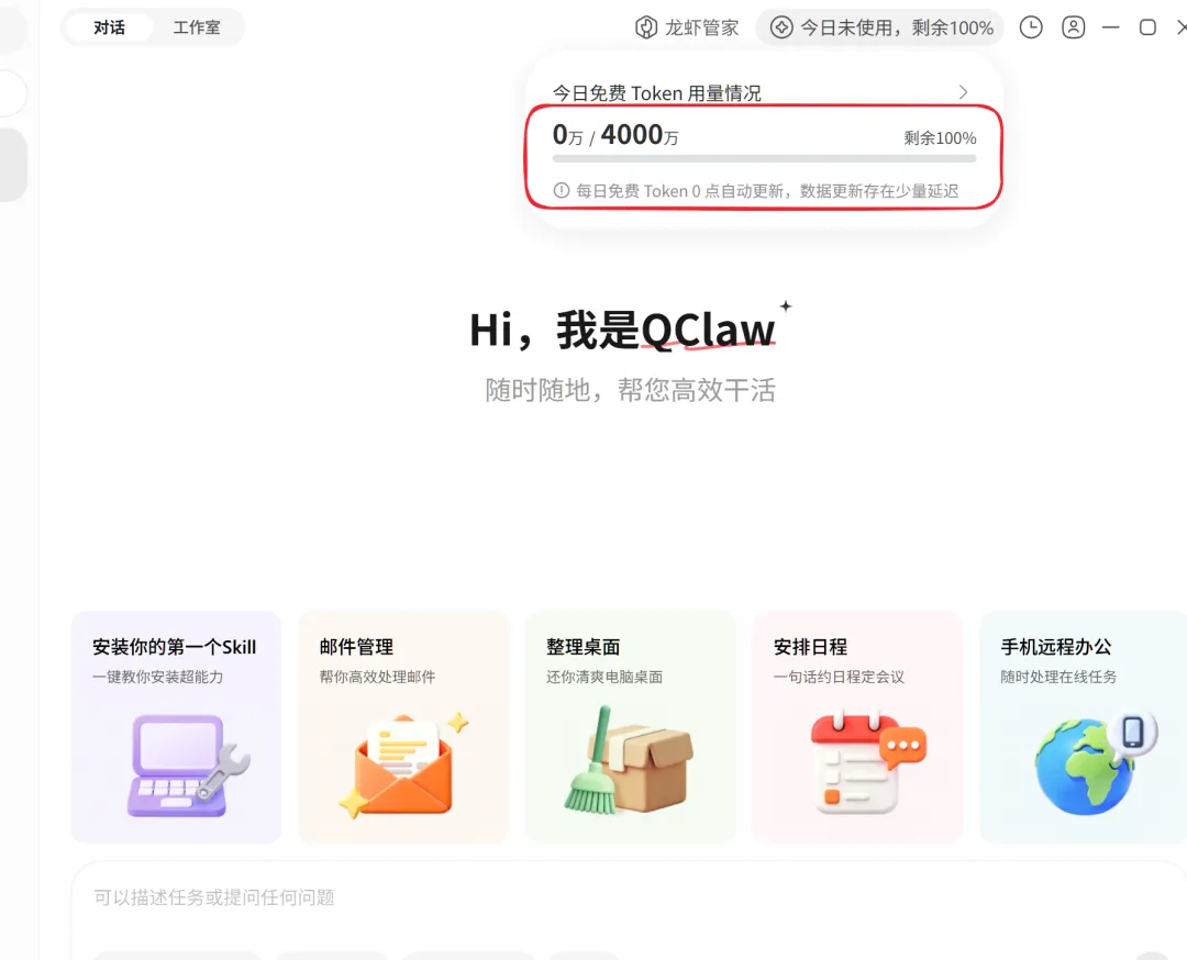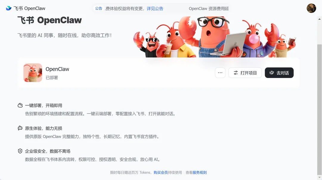 在前面自己搭建 OpenClaw 对接飞书,发现飞书可以免费在飞书云端搭建一个 OpenCLaw,每天会免费赠送token,不过体验下来发现用不了几次,比腾讯家的那两款还是差不少。