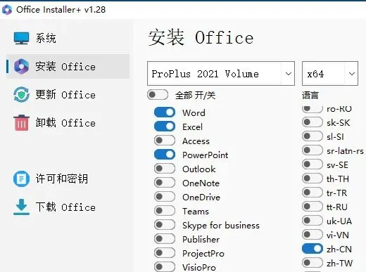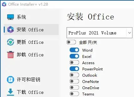 打开软件后,左侧能直接看到“安装Office”这个选项。点击进去之后,第一步要先选择需要安装的Office套件,比如我们常用的Office 2021 ProPlus批量版就很合适。选好版本后,接下来就是挑选组件了。