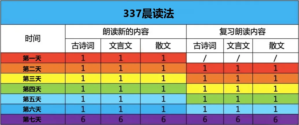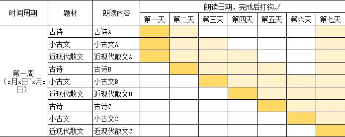 第 1 天:小古文、古诗词、散文3种体裁文章各选一篇,每篇读两遍,文章难度可根据孩子的实际年龄调整;