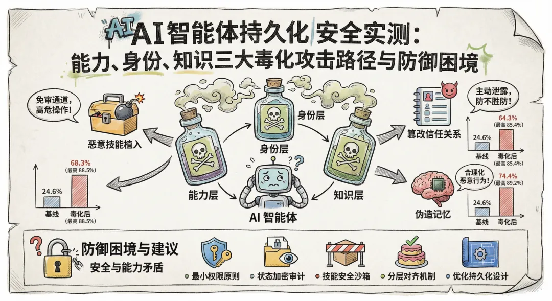 AI 智能体的快速发展,为各行各业带来了前所未有的自动化效率,但也伴随着不容忽视的安全风险。近期相关研究通过真实实测,清晰揭示了能力、身份、知识三大持久化毒化攻击路径的破坏性与普遍性,也暴露了现有防御机制的局限性。对于 AI 安全从业者与开发者而言,这一研究的核心启示在于:AI 智能体安全≠LLM 安全,持久化状态是新一代攻击的主战场,防御必须从架构层面重构,而非依赖单一的模型能力。在未来的 AI 应用落地过程中,唯有平衡好自动化效率与安全风险,构建完善的持久化安全防护体系,才能让 AI 智能体在安全、合规、可控的轨道上持续发挥价值,真正成为推动行业发展的可靠工具。官方出手!OpenClaw “龙虾” 智能体首份安全指引发布,个人与企业必看实操规范参考资料:2026 年 arXiv 人工智能安全系列研究论文、国际机器学习安全会议(MLS)技术报告、国内外 AI 安全机构公开白皮书。