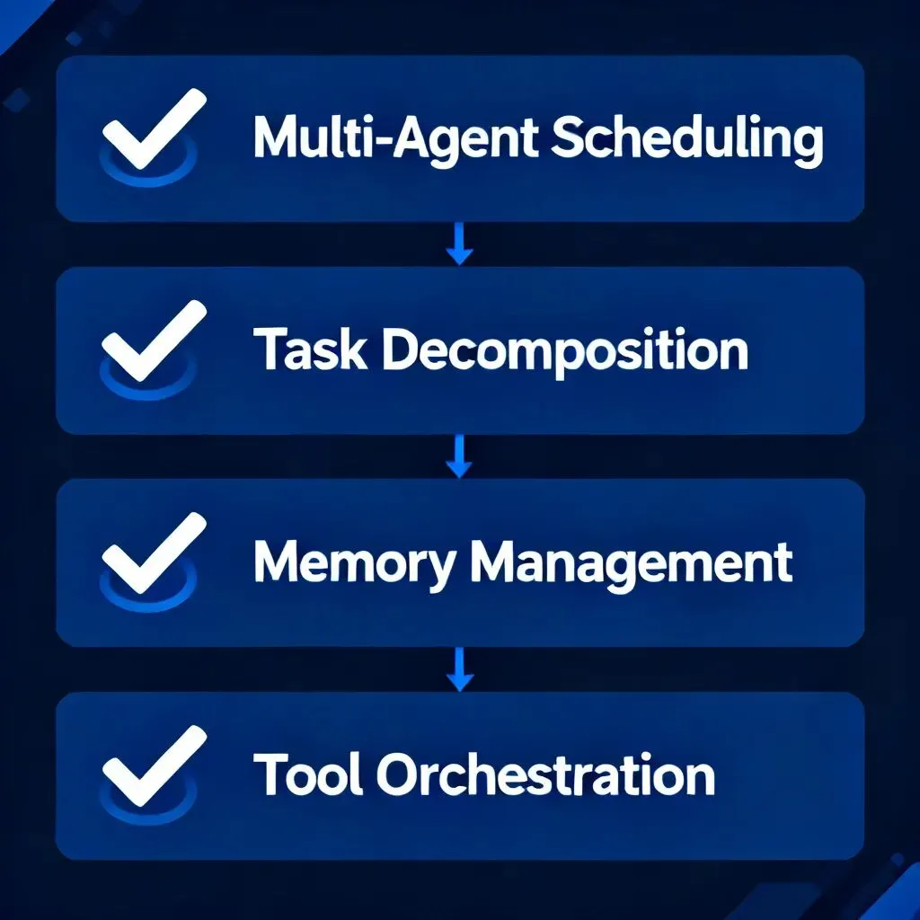 • 任务分解:把复杂任务拆成多个子任务 • 多 Agent 调度:分配给不同 Agent 执行 • 结果汇总:整合各 Agent 的输出