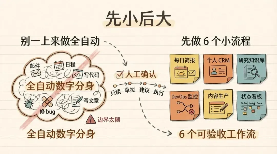 邮件、日程、客户沟通这种东西,第一阶段最好都留人工确认。别急着把钥匙交出去。