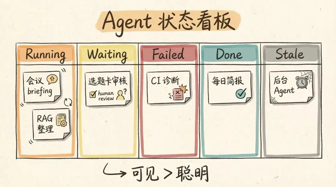 如果没有状态看板,多 Agent 很快会变成一堆黑盒。你只知道它们“在跑”,但不知道跑到哪。