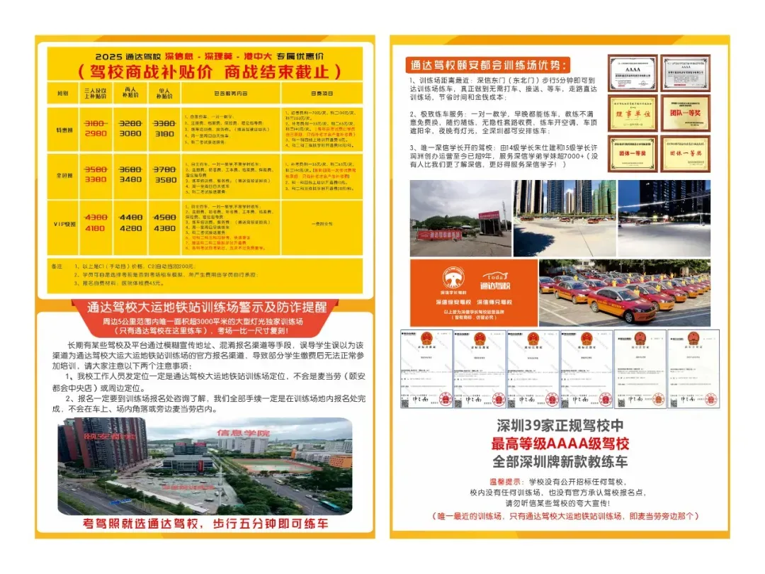 1、训练场距离最近:深信东门(东北门)步行5分钟即可到达训练场练车,真正做到无需打车、接送、等车,走路直达训练场,节省时间和金钱成本;