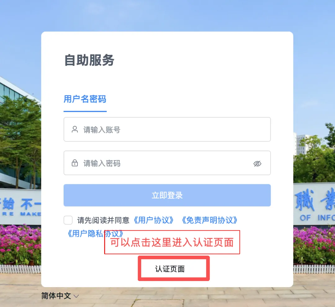 2.登陆自主服务页面,连接STU的Wi-Fi后,浏览器会自动弹认证页面,先不用管,点右上方的自主服务