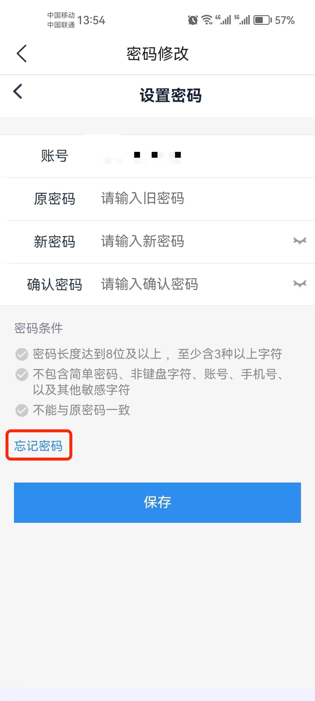 修改密码直接在左图填写修改即可,若忘记密码则点左上角蓝色字体忘记密码进行找回