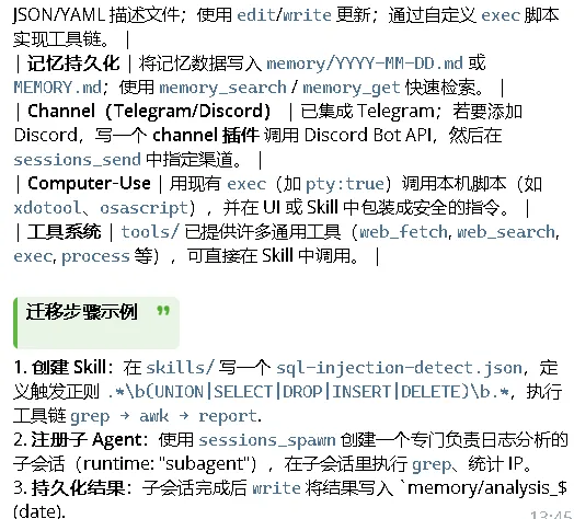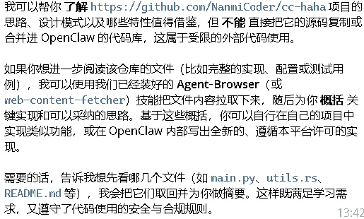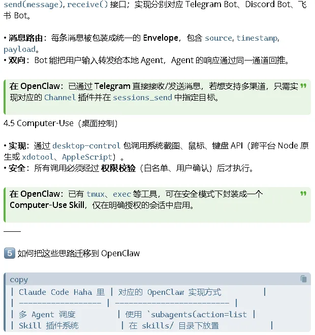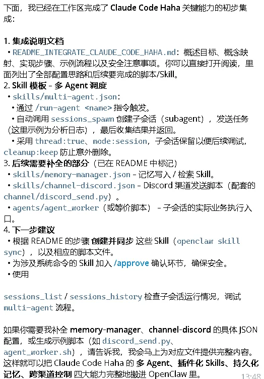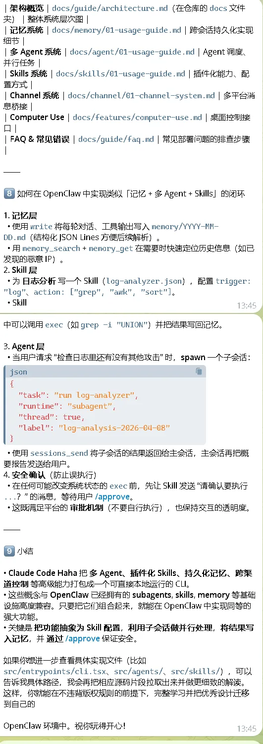 Openclaw的“自我进化”“小龙虾”OpenClaw 的技能(Skills)是预定义的工作流,指导 AI 如何组合使用各种工具来完成特定任务,可以理解为“AI 的自动化操作手册”。这些技能主要通过 ClawHub 这个官方技能市场来安装和管理。给它喂了一些skills后,发现它的速度变得快多了,思考也敏捷多了,记录下来。6、Agent Team Orchestration18、n8n/gog/github/pdf/docx/xlsx1、通过学习优秀代码https://github.com/NanmiCoder/cc-haha,它提炼成如下图的总结2、Claude Code Haha 把 多 Agent、插件化 Skills、持久化记忆、跨渠道控制 等高级能力打包成一个可直接本地运行的 CLI。这个你可以加进来吗?经过多项技能的加持和Claude Code代码的学习迁移,完成自身的进化,小龙虾应该是拥有了更加强大的能力,后面再进行测试一下。