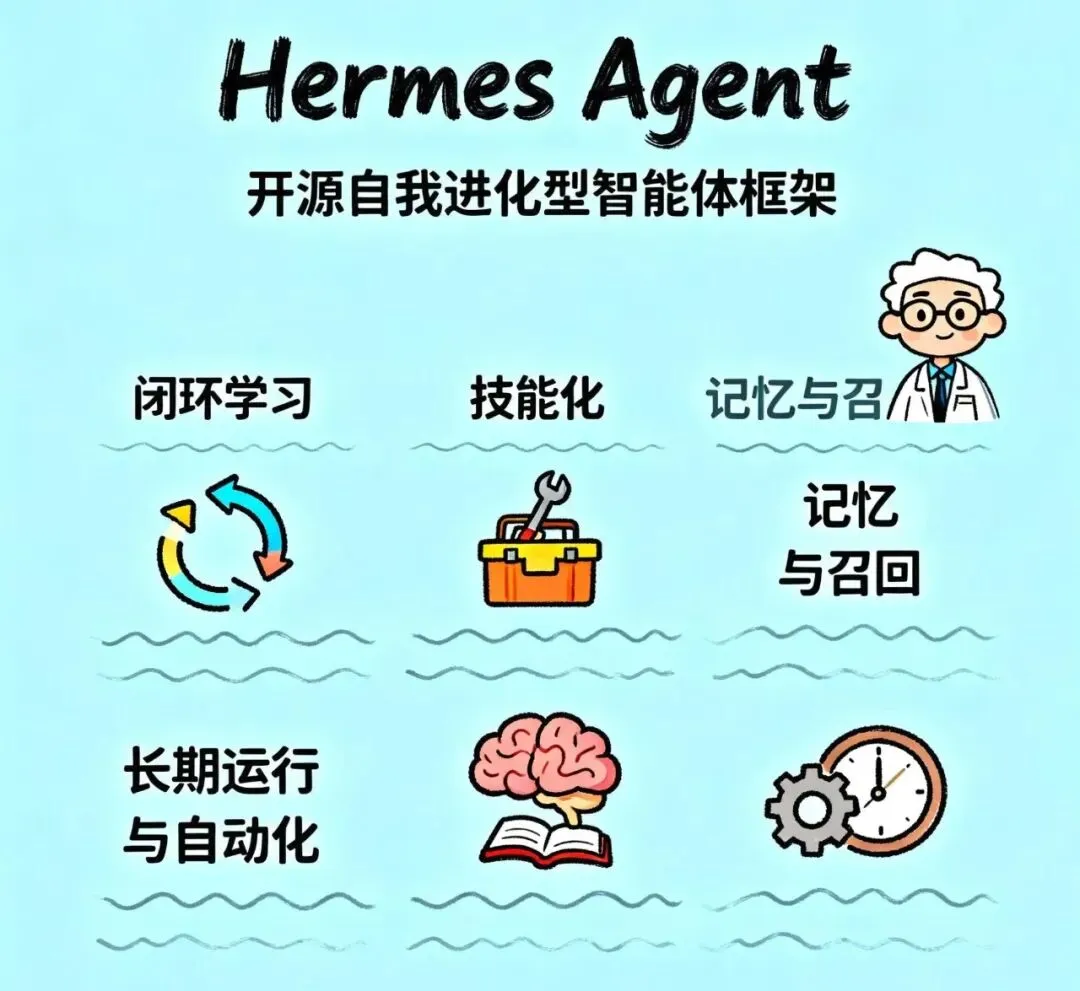 Hermes Agent 的核心卖点可以概括为四个词:闭环学习(Learning loop)、技能化(Skills)、记忆与召回(Memory & Recall)、长期运行与自动化(Persistence & Automation)。