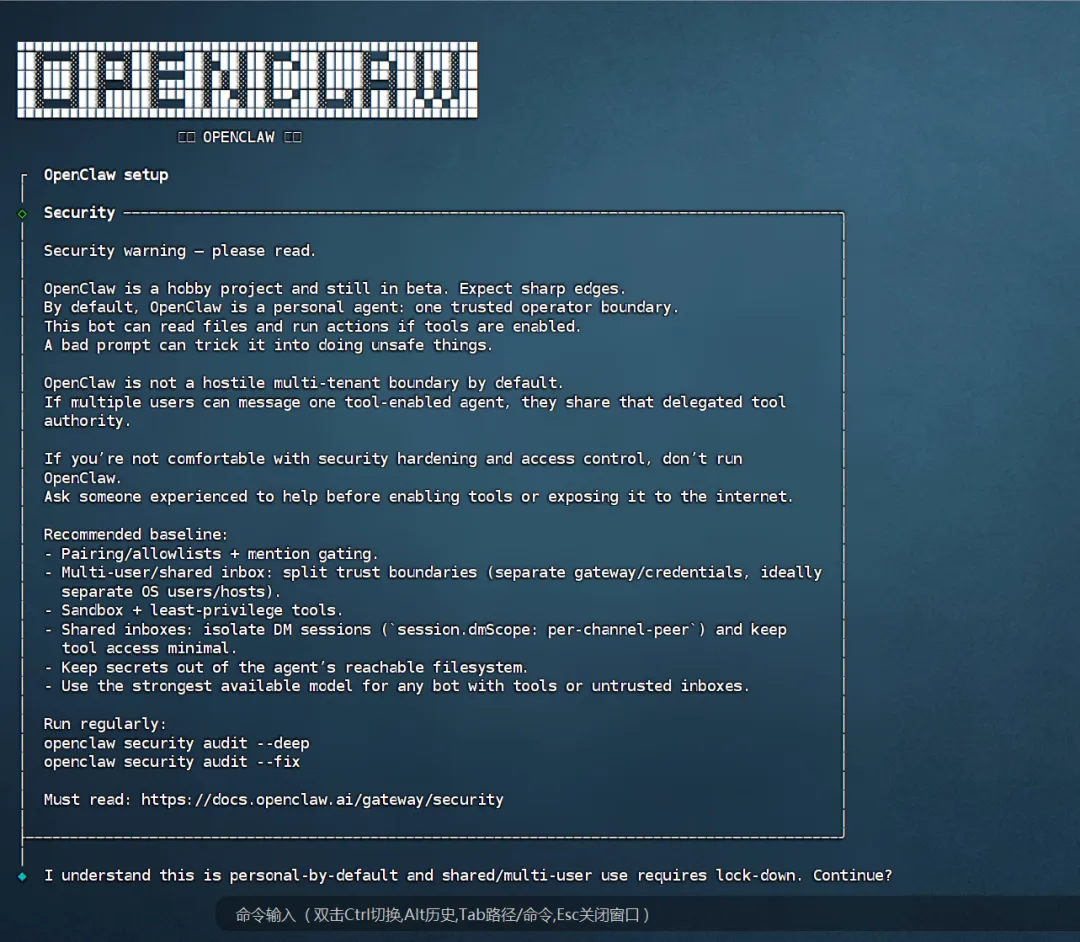 I understand this is powerful...: 选择 YesOnboarding mode: 选择 QuickStartModel/auth provider: 选择 Skip for now(后续手动配)Filter models: 选择 All providersConfigure skills?: 选择 NoHow do you want to hatch your bot?: 选择 Hatch in TUI