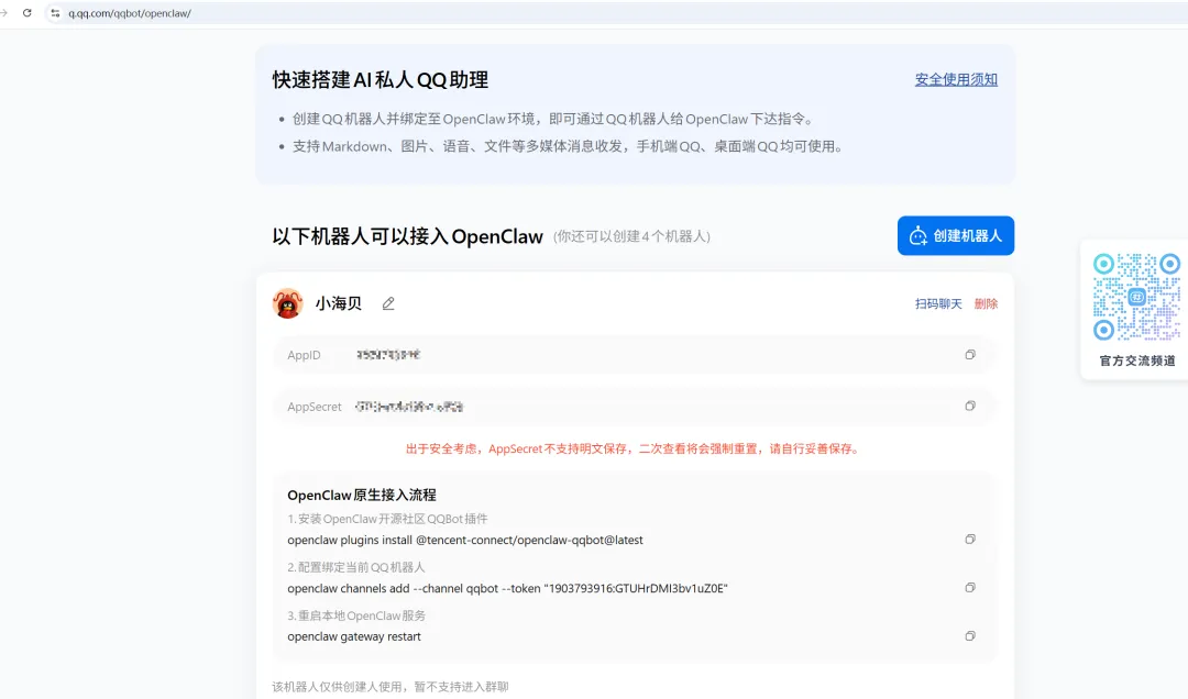 ⚠️注意:AppSecret 只会显示一次!离开页面之前务必复制保存。如果忘记了,只能重新生成。
