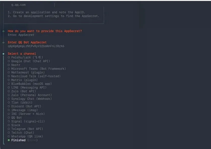 openclaw config随后跟着提示一步步往下执行,填写好AppID和AppSecret就可以了。